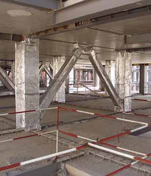 Используются материалы, предоставляющие защиту от огня и действия коррозии. Самый актуальный способ огнезащиты конструкций из бетона. Есть два типа таких материалов: вспучивающиеся и не вспучивающиеся.